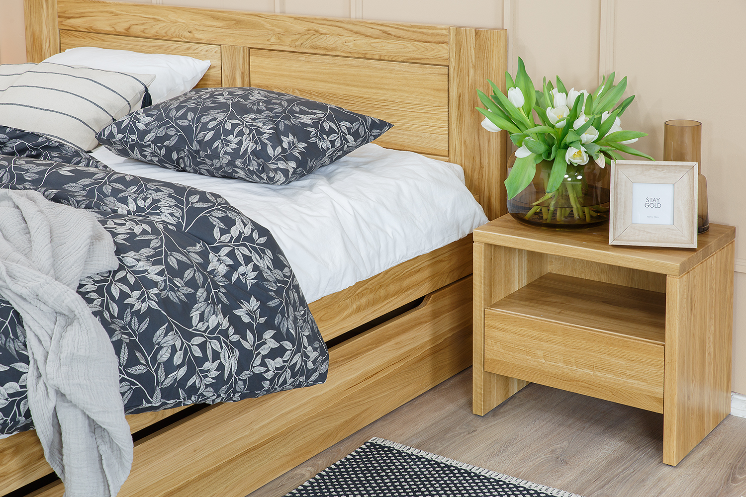 Szafka nocna SN212 została zaprojektowana z myślą o wnętrzach z charakterem. Proste bryły oraz stonowane kolory naturalnego dębowego drewna pozwalają urządzić nowoczesne wnętrze. Swój modny, minimalistyczny wygląd szafka zawdzięcza bezuchwytowej szufladzie oraz otwartej półce, które stanowią idealne miejsce do przechowywania podręcznych kosmetyków czy magazynów.
